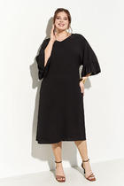 Платье с центральной застежкой на петли и пуговицы, без воротника, без рукавов, на бретелях. Платье отрезное по линии талии. Лиф переда с нагрудными и талиевыми вытачками. Лиф спинки со средним швом, талиевыми вытачками. Нижняя часть переда и спинки расширенная к низу, с двумя односторонними складками по переду и талиевыми вытачками по низу. По нижней части платья вставки из кружева разной ширины.
