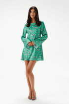 Платье, прямого силуэта, без застежки, без воротника, с V-образным вырезом горловины. По переду с нагрудными вытачками, втачным воланом по горловине переда и спинки, и по среднему шву переда. Спинка цельная. Рукав втачной, короткий, присборен по низу тремя строчками эластичной нитью . Окат рукава со сборкой. По краю воланов и низу рукава- отделочное кружево в цвет основной ткани. Платье со съемным поясом.