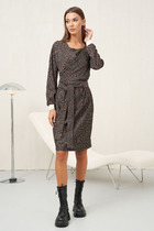 Платье с застежкой на потайную молнию в среднем шве спинки, с круглым вырезом горловины,со съемным воротником. По переду с рельефами, выходящими из проймы. Платье отрезное по линии талии. Нижняя часть переда и спинки расширенная к низу. По нижней части переда два рельефа, левый рельеф заканчивается разрезом. Нижняя часть спинки со средним швом, двумя рельефами. Рукав втачной, длинный, со съемными манжетами.