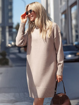 Платье без застежки, без воротника, с V-образным вырезом горловины. Перед цельный, спинка со средним швом, заканчивающимся шлицей. Рукав втачной, длинный. Платье со съемным поясом из кожезаменителя.