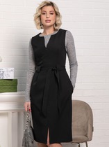 Платье с центральной застежкой на потайную молнию в среднем шве спинки, без воротника, с круглым вырезом горловины. По переду- с нагрудными вытачками. Спинка со средним швом, заканчивающимся шлицей. Рукав цельнокроенный, с отрезной манжетой, короткий. Платье со съемным поясом. По боковым швам расположены шлевки для сьемного пояса.