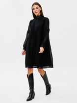 Платье с центральной застежкой на петли и пуговицы, втачным воротником с отрезной стойкой. По переду с клапанами. Спинка с отрезной кокеткой, переходящей на перед. Платье двойное. Нижнее платье на бретелях, с нагрудными вытачками по переду. Платье со съемным поясом.