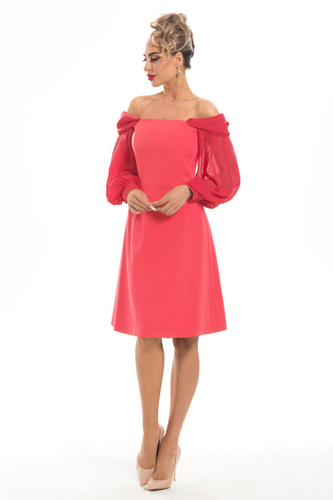 Платье, без воротника, с центральной застежкой на потайную молнию в среднем шве спинки. Платье отрезное по линии талии. Лиф переда с рельефами, выходящими из горловины. Лиф спинки со средним швом, рельефами, выходящими из проймы. Нижняя часть спинки со средним швом, талиевыми вытачками. Платье на широких бретелях, присборенных по шву притачивания к верхнему срезу платья по переду и спинке. Рельефы переда и спинки усилены регилином. Рукав втачной, длинный, с отрезной манжетой. Рукав присборен по окату и шву притачивания манжеты.