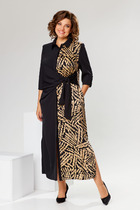 Платье, с застежкой на потайную молнию по среднему шву спинки, без воротника, с фигурным вырезом горловины. Платье отрезное по линии талии. Нижняя часть платья состоит из двух воланов. Лиф переда с рельефами, выходящими из горловины. Лиф спинки со средним швом, рельефами, выходящими из горловины. Рукав втачной, длинный, с отрезной манжетой. Окат и шов притачивания манжеты присборен. Платье со съемным поясом.