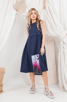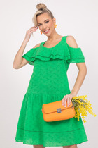 Платье, с застежкой на потайную молнию по среднему шву спинки, без воротника, с фигурным вырезом горловины. Платье отрезное по линии талии. Нижняя часть платья состоит из двух воланов. Лиф переда с рельефами, выходящими из горловины. Лиф спинки со средним швом, рельефами, выходящими из горловины. Рукав втачной, длинный, с отрезной манжетой. Окат и шов притачивания манжеты присборен. Платье со съемным поясом.
