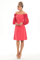 Платье с центральной застежкой на петли и пуговицы, втачным воротником- стойкой. Спинка со съемным швом. Рукав короткий, цельнокроенный с отложной манжетой. Платье со съемным поясом.