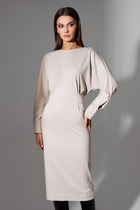 Платье расширенное к низу, без воротника, с V-образным вырезом горловины, с центральной двубортной застежкой на петли и пуговицы. Перед с нагрудными вытачками. Спинка со средним швом. В боковых швах расположены карманы. Рукав втачной, крылышко. Платье со съемным поясом.