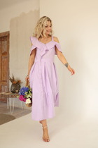 Платье женское полуприлегающего силуэта без подкладки из натуральной ткани со втачными рукавами и V-образным вырезом горловины. По переду платья декоративная планка, в боком шве застежка-молния.