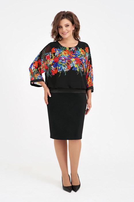 Женское платье свободного силуэта, отрезное по линии талии. Верх платья выполнен из легкого непросвечивающегося шифона с дизайнерским принтом на трикотажной подкладке, рукава цельнокроенные "летучая мышь", вырез горловины округлой формы, по линии талии и низу рукавов декоративный пояс и манжет из шёлк-сатина. Низ платья выполнен из плательной ткани средней плотности без подкладки.