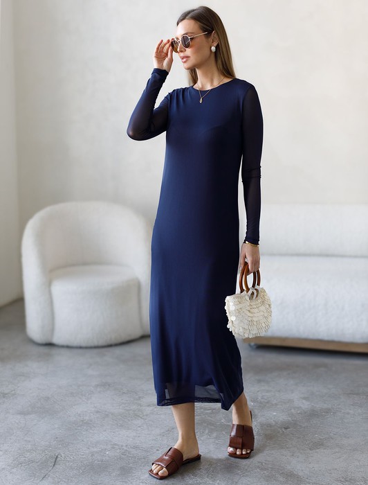 Состав: 95%ПЭ 5%ПУ; ПОДКЛАДКА- 95%Вис 5%ПУ Плотность: 90 Г/м2Модель выполнена из воздушной сетчатой ткани с вискозной подкладкой, которая подчеркивает фигуру. Прямой крой создает стройный силуэт. Богатый темно-синий цвет создает эффект глубины и роскоши. Прозрачные рукава добавляяют образу пикантности. Идеально подходит как для вечерних выходов, так и для повседневного образа.