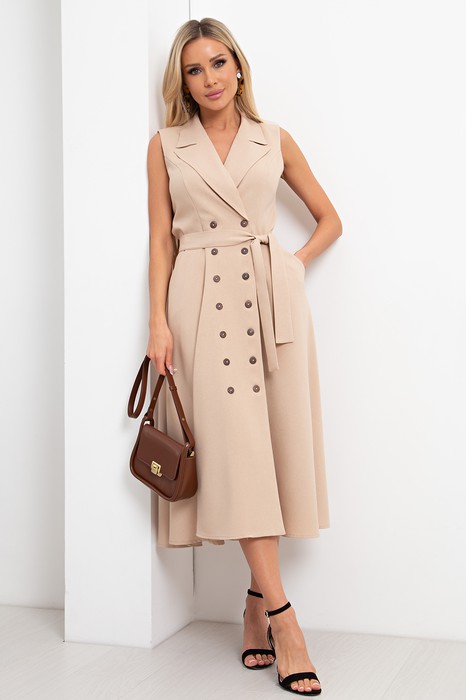 Элегантный сарафан приталенного силуэта, с английским воротником из плательно - костюмной ткани. По переду выполнена двубортная застежка на петли и пуговицы. Модель отрезная по линии талии, дополнена функциональными карманами. Пояс из основного материала в комплекте.