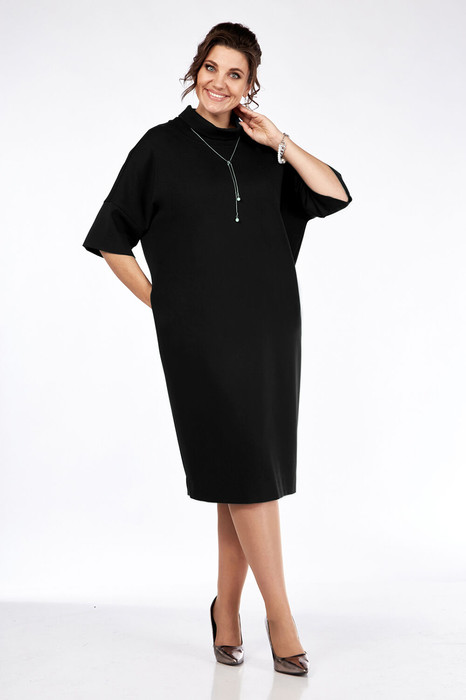 Платье женское, свободного силуэта изготовлено из трикотажного полотна. Горловина с отрезной деталью обработана  воротником — стойкой. Рукав спущенный. В боковых швах обработаны карманы. В комплекте съемная подвеска.
