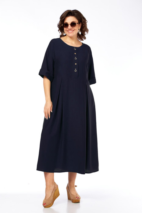 Платье женское, свободного силуэта выполнено из плательной ткани с эффектом мятости. Изделие отрезное по линии талии, на юбке платья заложены встречные складки по переду и спинке. На лифе переда обработана  планка, с декоративной вышивкой. Рукава спущенные с отложным  манжетами. В боковых швах обработаны карманы. Платье частично на подкладке.