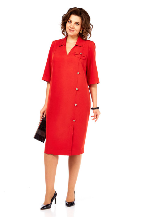Платье женское прямого силуэта, выполнено из костюмно-плательной ткани. Вырез V-образной формы с отложным воротником. По переду обработан ассиметричный рельеф со шлицей по низу и декоративный клапан на груди. Спинка с кокеткой и средним швом. Рукава втачные, по низу отложные манжеты. Платье дополнено съемным поясом из основной ткани с полукольцами и декоративными пуговицами.