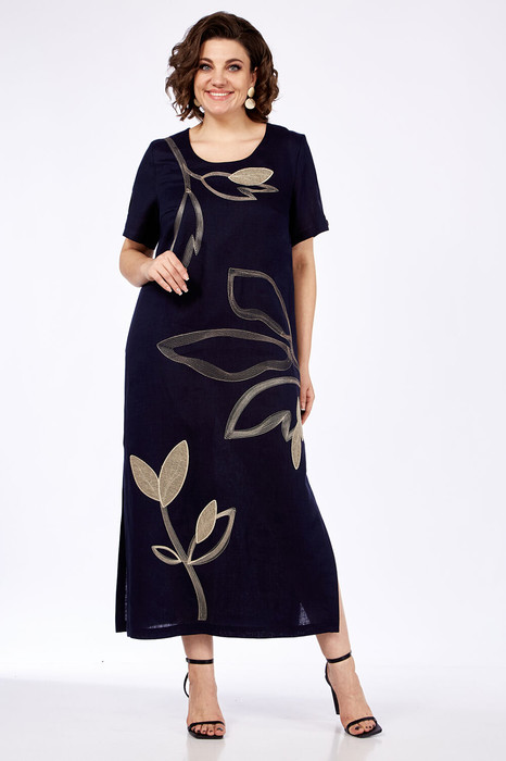 Платье женское прямого силуэта, изготовлено из натуральной ткани. Горловина круглой формы. По переду нагрудные вытачки. На спинке средний шов. В боковых швах обработаны карманы, внизу разрезы. Рукава втачные, разрезные с фигурным вырезом. Платье декорировано дизайнерской вышивкой.