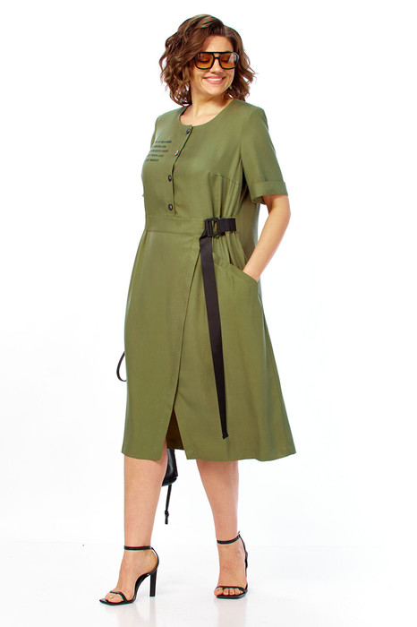 Платье женское, А-силуэта выполнено из натуральной ткани. По переду застежка на петли и пуговицы. Платье отрезное по линии  талии, с декоративным поясом, частично присобранным на эластичную тесьму. Нижняя часть юбки  с имитацией запаха, с левой стороны обработан карман с планкой. Спинка со встречной складкой. Рукава втачные, короткие, с отложной манжетой. Платье дополнено печатью.