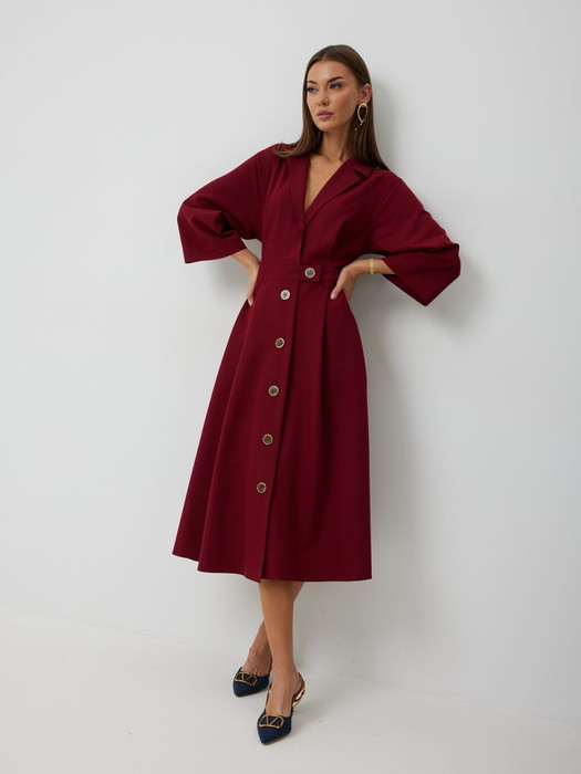 Платье женское полуприлегающего силуэта, отрезное по линии талии с застежкой по центральной части переда на декоративные пуговицы. Платье длиной до середины икры. По отрезному лифу с юбке полочки и спинки заложены складки. Лиф с юбкой соединены втачным поясом, по которому прострочена отделочная строчка. Рукав втачной прямой до середины локтя. По пройме прострочена отделочная строчка. Горловина платья обработана втачным воротником с отложными лацканами.