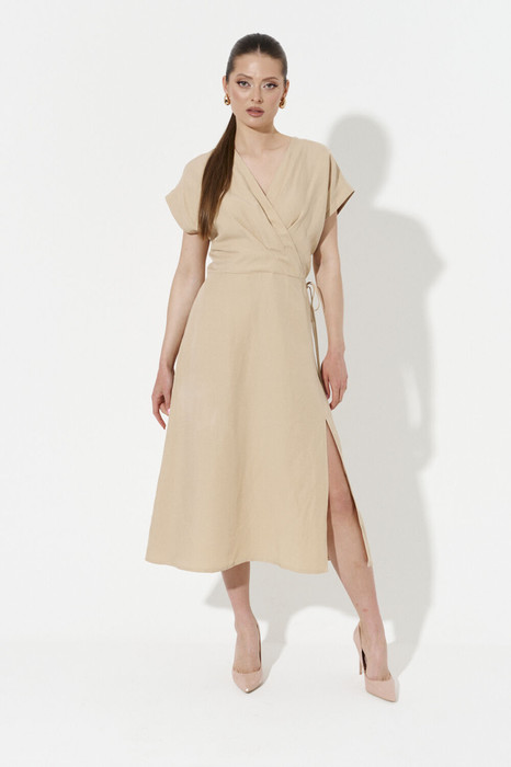 Платье женское из смесовой ткани с добавлением льна для повседневной носки. Платье полуприлегающего силуэта. Платье на запах, а также отрезное по линии талии. Платье имеет завязки в боковом шве. Лиф переда имеет защипы. В юбке в боковых швах имеются потайные карманы. Горловина V-образная. Рукава цельнокроеные короткие. Длина изделия миди. Легкое и очень стильное платье, которое будет давать настроение на каждый день. Данное платье станет не заменимой вещью в вашем гардеробе, оно обязательно покорит вас своей чудесной посадкой.