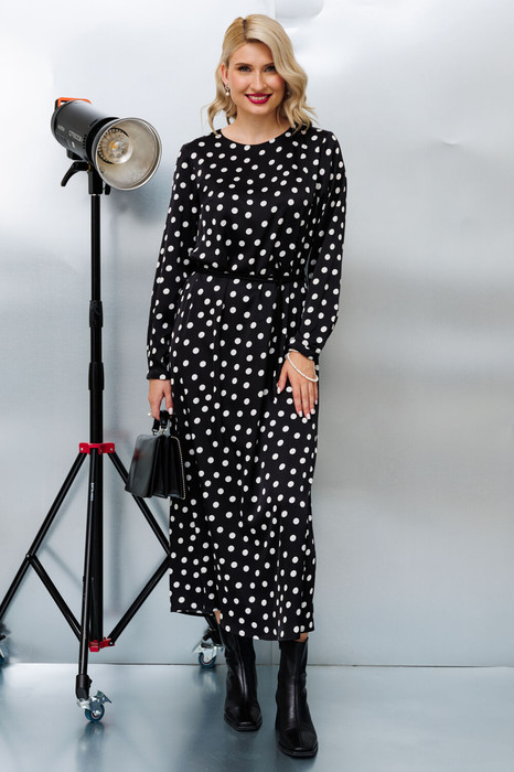 Прямое платье макси в горошек. Платье на подкладке. Застежка по спинке на петлю-пуговицу. Эффектное платье простого силуэта. В комплекте идет пояс, которым можно подчеркнуть линию талии.