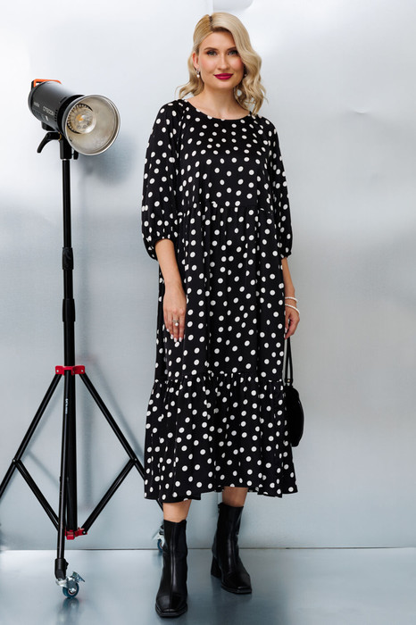 Платье в горошек со сборками. Застежка по спинке на петлю-пуговицу. Рукав укороченный. Романтичное платье в милый принт для ваших элегантных образов.