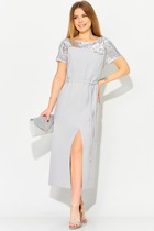 Вырез горловины платья «лодочка», застежка на потайную тесьму-молнию в левом боковом шве. Деталь переда и спинки платья с кокеткой, украшенной пайетками, нижняя часть с рельефными швами, со средним швом, который заканчивается разрезом. Линия плеча спущена, рукав короткий. В комплекте съемный декоративный пояс из основной ткани и декоративное украшение.