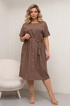 Платье женское, полуприлегающего силуэта, с втачными рукавами, длиной до коленей. Деталь переда платья с нагрудными вытачками, вверху расположена аппликация-печать и прикреплены «пайетки с бусинами». Деталь спинки платья со средним швом, который заканчивается разрезом. Рукава втачные одношовные, короткие. Вырез горловины платья округлой формы, с втачной бейкой. По низу платья съемный элемент из отделочной ткани, который застегивается на 15 петель и 15 пуговиц.