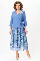 Платье женское, полуприлегающего силуэта, с втачными рукавами, длиной до коленей. Деталь переда платья с нагрудными вытачками, вверху расположена аппликация-печать и прикреплены «пайетки с бусинами». Деталь спинки платья со средним швом, который заканчивается разрезом. Рукава втачные одношовные, короткие. Вырез горловины платья округлой формы, с втачной бейкой. По низу платья съемный элемент из отделочной ткани, который застегивается на 15 петель и 15 пуговиц.