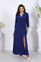 Платье отрезное по линии талии, округлой горловиной. Полочка состоит из центральной детали и вертикальных рельефных бочков, переходящих в цельнокроеные рукава укороченной длины. Длина рукава по плечевому шву от края горловины 31 см.