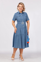 Платье создано из струящейся плотной сатиновой группы, отрезное по линии талии и притачной юбкой кроя «полусолнце». Лиф платья отрезной с фиксируемыми по талии сторонами на запах. В плечевых швах и линии талии заложены модельные складки. Горловина изделия по спинке имеет незначительную стойку 2 см, переходящую на полочку в углубленный V-образный вырез. Рукав втачной, одношовный, имеет деликатное расклешение. Длина рукава 42-43 см. Юбка изделия покроя «полусолнце», на линии талии со стороны спинки и полочки две модельных складки, в одной из которых на переднем полотнище, слева, расположен открытый разрез, высотой 44 см. В левом боковом шве размещена застежка на потайную молнию. Платье дополнено съемным текстильным поясом.