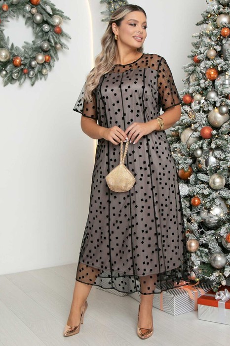 Платье выполнено из легкой прозрачной сетки с оригинальным геометрическим узором,