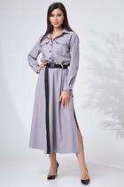 Платье женское без подкладки, полуприлегающего силуэта длиной выше колена. Вырез горловины круглый. По переду средний шов, талиевые вытачки и прорезные функциональные карманы с листочкой. Спинка со средним швом и талиевыми вытачками. Застежка на потайную тесьму-молнию в среднем шве спинки. Рукава длинные с разрезом по низу переходящим в складку, который украшен красивыми пуговицами с камнями.