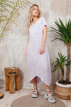 Платье женское легкое, шифоновое, удлиненное, без подкладки, свободного кроя. По переду и спинке отрезное по линии талии, по низу два волана со сборкой. Застежка до линии талии на обтяжные пуговицы и петли , под застежкой пришит тонкий поясок из основной ткани имитирующий затяжку кулисы. Рукав втачной, одношовный. По низу рукава и подрезу линии талии узкая резинка. Вырез горловины круглый, по горловине переда небольшая сборка. По правой стороне волана переда - разрез, который придает этому легкому платью еще больше женственности и кокетливости.