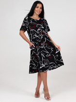 Платье женское, по линии талии отрезной фигурный пояс, нижняя часть платья со сборкой и в нижнюю часть платья вставлена хлопковая подкладка. По верхней части переда небольшая сборка из линии пояса. Спинка с узкой горизонтальной кокеткой. В верхней части спинки из линии кокетки и линии пояса спроектирована небольшая сборка. Вырез горловины "V- образной" формы. Рукав одношовный, короткий, втачной, со сборкой по окату. В боковых швах расположены функциональные карманы. Застежка на петли и пуговицы до низа изделия.