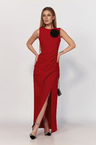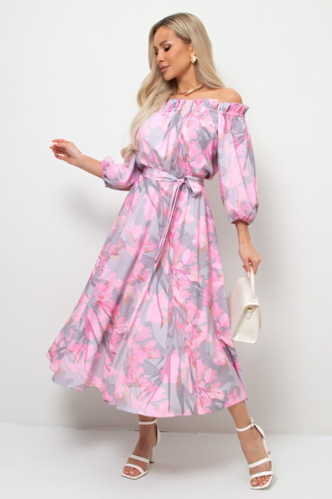 Платье приталенного силуэта. Глубокий вырез горловины собран на эластичную ленту. Платье можно носить в двух вариантах с открытыми и закрытыми плечами. Нижняя часть рукава и окружность талии собрана на эластичную резинку. Расклешенная юбка будет эффектно струится при ходьбе. Пояс из основного материала в комплекте.