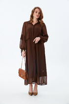 Платье свободного силуэта со спущенной линией плеча. Воротник рубашечного типа на стойке. Центральная застёжка на петли и пуговицы. По передним половинкам платья накладные карманы с цельнокроеным клапаном. Низ платья фигурный. Спинка платья чуть длиннее переда, по низу обработана обтачкой. Низ присборивается на шнур из основной ткани, таким образом формируя желаемый силуэт платья. Рукав двухшовный. Низ рукава на притачной манжете с патой. По верхнему центральному шву рукава пришиты две пуговицы, что позволяет регулировать длину рукава.