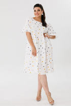 Эффектное платье в стиле «Бохо» из очень приятной  принтованной  ткани  дополнено готовым поясом , отлично подходит для шпилек и обуви на плоском ходу.  Платье А образного силуэта  с притачным воланом отрезное по линии талии (на резинке).  Лиф со средним швом и округлым вырезом на завязках с фиксаторами, Рукав комбинированного покроя, линия плеча приспущена, нижняя часть  со складками и резинкой по низу (можно регулировать длину рукава).  Съемный пояс  фабричного производства  завершает весь образ.