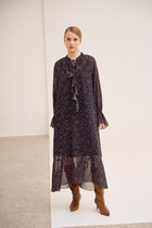 Платье с округлым вырезом горловины и фигурным низом. Изделие с кокеткой по переду и спинке. Перед с дизайнерскими фигурными отрезными деталями и пришивным декором в верхней части. Спинка с дизайнерскими фигурными деталями. Рукава втачные с отворотами и патами с пуговицами по низу. Платье с карманами в боковых швах.