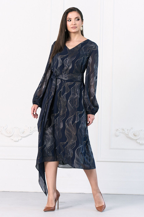 Платье с V- образным вырезом горловины, съёмным поясом по талии и фигурным низом. Спинка с талиевыми вытачками. Рукава втачные, с узкой резинкой по низу. Изделие на подкладке.