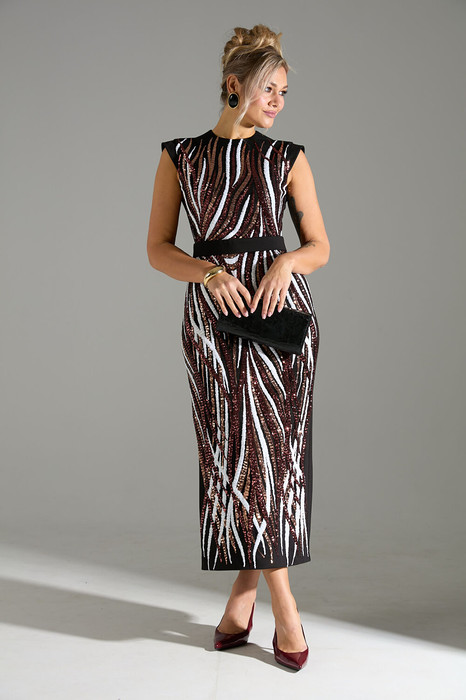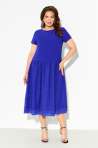 Платье приталенного силуэта выполнено из плотного трикотажного полотна. Перед платья декорирован сеткой с вышивкой из пайеток. По спинке расположены талиевые вытачки. По среднему шву спинки разрез длинной 56 см и застежка на потайную молнию. Горловина и пройма обтачные, рукав выполнен в виде небольшого ""крылышка"".