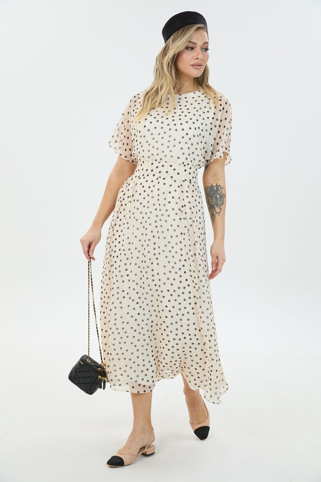 Платье длины "миди" с объёмной юбкой выполнено из лёгкой ткани с принтом. Застежка на потайную молнию по среднему шву спинки. В комплекте идет длинный съемный пояс. На юбке по линии талии заложены складки.