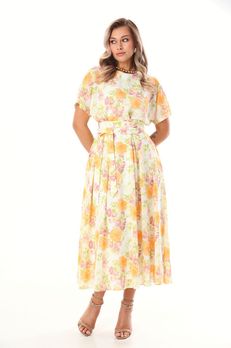 Платье из лёгкой ткани с ярким принтом. Застежка на потайную молнию по среднему шву спинки. В комплекте идет длинный съемный пояс. На юбке по линии талии заложены складки. Длина 128 см.