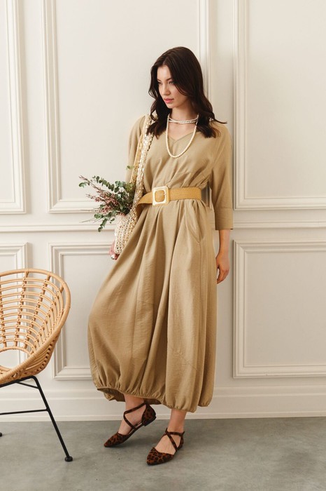 Платье свободного кроя в стиле "Бохо". Рукав реглан, по низу рукава манжеты на застёжку петлю и пуговицу. У- образный вырез горловины. По переду косые подрезы, по спинке средний шов низ платья собран на резинку.
