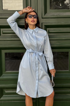 Платье женское отрезное по линии талии, расширенное книзу по центральной застежке на петли и пуговицы. Перед с нагрудными вытачками и вышивкой с левой стороны в области груди. В боковых швах - карманы. Спинка со средним швом по нижней части. Горловина округлой формы, слегка углублена. Рукав втачной одношовный, короткий с отложной манжетой по низу. Платье в комплекте с декоративным ремнём.