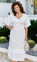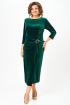 Платье с завышенной линией талии. По низу полочки декоративная горизонтальная складка. Рукав короткий прямой. Горловина округлой формы, сзади застегивается на пуговицу и воздушную петлю. Юбка присборенная, на подкладке, карманы в боковых швах.