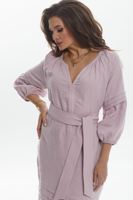 Платье прямого силуэта с карманами в боковых швах. Перед со средним швом, заканчивается разрезом. Горловина по переду и спинке присборена и обработана декоративной бейкой из основной ткани. Рукав реглан со сборкой у горловины, расширенный книзу на резинке. По рукаву и низу платья декоративные складки. В комплекте пояс из основной ткани.