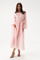 Платье в стиле бохо силуэта трапеция.Спинка со средним швом.По переду нагрудные вытачки и декоративная вышивка.Горловина слегка расширена, округлой формы. Рукав втачной ,3/4. Низ рукава подбирается патой с застёжкой на пуговицу. В боковых швах обработаны карманы.