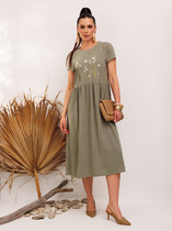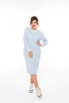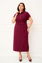 Платье полуприлегающего силуэта , слегка зауженное к низу. Спинка со средним швом и шлицей. Горловина округлой формы , по спинке с застёжкой на пуговицу и навесную петлю.По переду средний шов , нагрудные вытачки, на уровне талии декоративные складки, переходящие в пояс.
