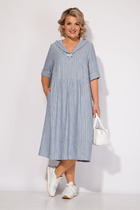Платье прямого силуэта,с карманами и разрезами в боковых швах. По спинке средний шов. По переду нагрудные вытачкии и декоративная вышивка в области груди. Горловина округлой формы, обработана кружевом. Плечо спущено. Рукав 3/4 с цельнокроенной манжетой. Пояс из основной ткани.