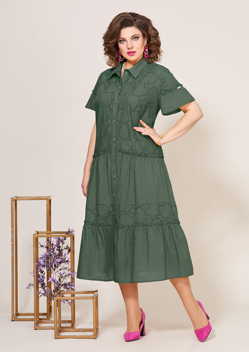 Эффектное женское платье свободного силуэта, выполнено из однотонного хлопка и хлопка с вышивкой. Лиф платья выполнен из хлопка с вышивкой, удлиненный, с нагрудными выточками. Застежка платья на планку с пуговицами, горловина обработана воротником.  По низу платья обработаны притачные воланы из однотона и хлопка с вышивкой. Рукав втачной, выполнен из хлопка с вышивкой и воланом из однотона. Спинка идентична полочке, выполнена из хлопка с вышивкой и однотонного хлопка, с воланами по низу. Очень эффектное платье прекрасно подойдет для повседневного гардероба, также будет уместно смотреться на любом торжестве!