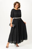Платье с частичной застежкой на петли и пуговицы. По левой части переда накладной карман и подрез, по правой части переда декоративные защипы. В боковых швах карманы. Спинка с защипами по верху. Рукав втачной короткий с небольшой сборкой по верху. Длина платья 108см, длина рукава 26 см.